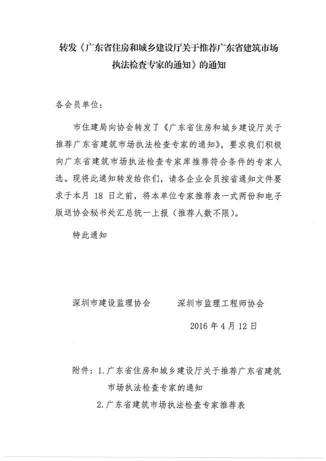 转发《省住建厅关于推荐广东省建筑市场执法检