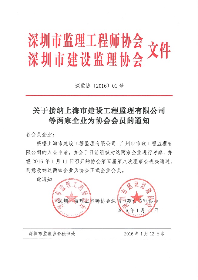 关于接纳上海市建设工程监理有限KY.COM等两家企