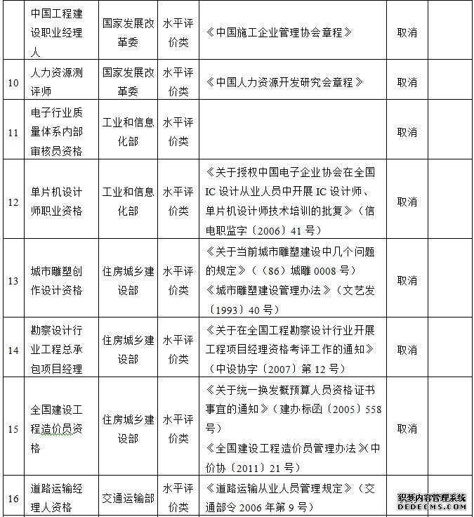 国发〔2016〕5号 各省、自治区、直辖市人民政府,国务院各部委、各直属机构: 经研究论证,国务院决定取消61项职业资格许可和认定事项,现予公布。同时,建议取消1项依据有关法律...
