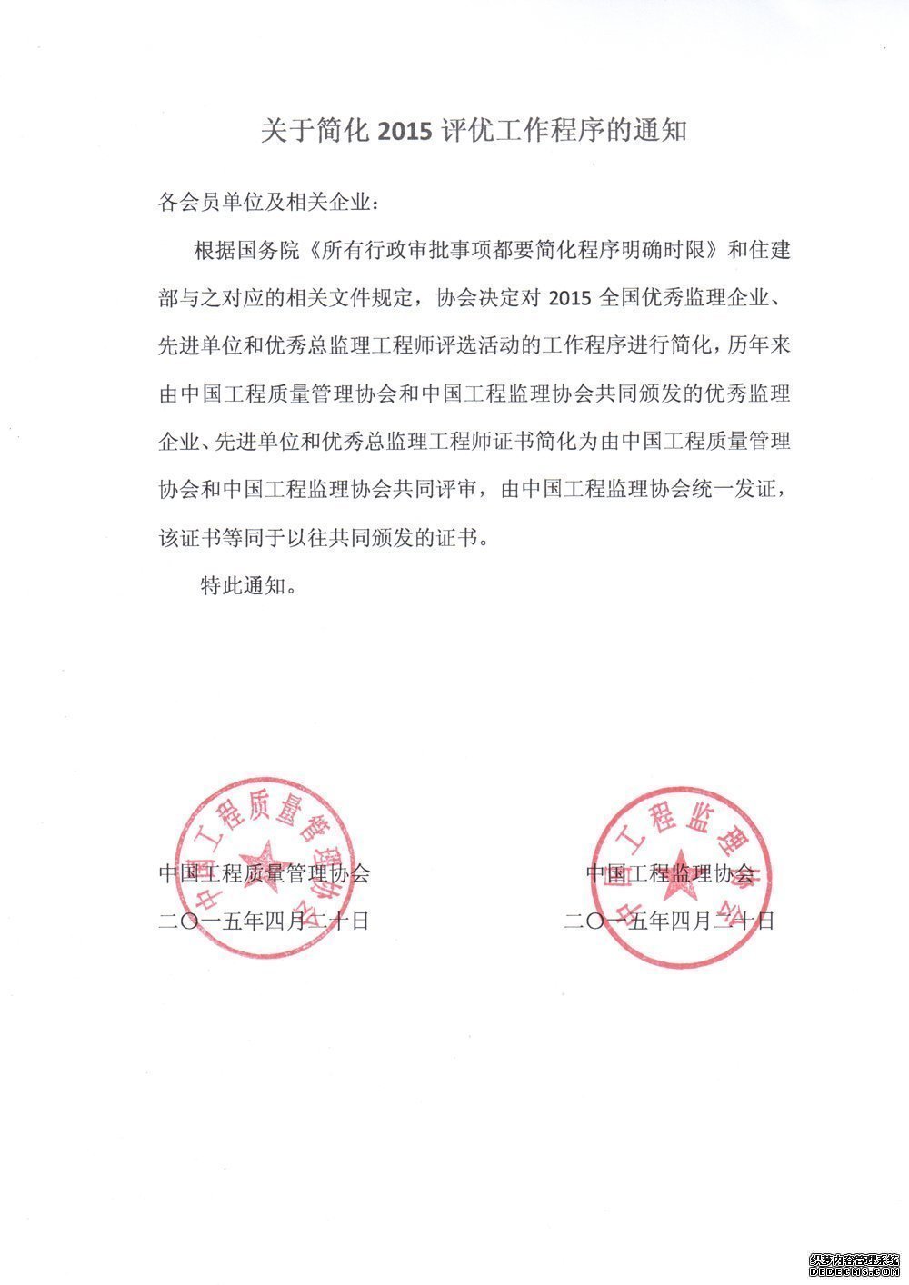 关于简化2015评优工作程序的通知